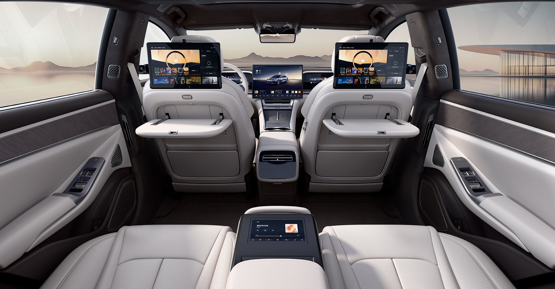 ·12.8英寸双智能头枕屏 ·7英寸智能扶手屏 ·后排双柔光化妆镜 ·后排双桌板